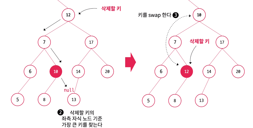 key 값을 대체할 노드는 삭제한 노드의 키 기준 왼쪽 서브트리의 가장 오른쪽에 있는 노드 또는 오른쪽 서브트리의 가장 왼쪽에 있는 노드이다. 서브트리가 하나만 있으면 해당 서브트리에서 대체 노드를 찾으면 되며 두 개의 서브트리가 있다면 어느 쪽의 서브트리에서 대체 노드를 찾아도 무방하다.
