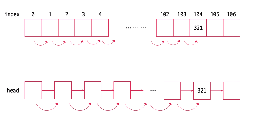 다음과 같이 배열과 연결리스트 모두 앞에서부터 순차적으로 탐색해야 값을 찾을 수 있고 최악의 경우 해당 값이 맨 마지막에 있다면 O(n)의 시간복잡도를 갖는다. 이러한 선형적인 구조의 탐색 비효율성은 데이터의 크기가 증가할수록 선형적으로 증가한다.