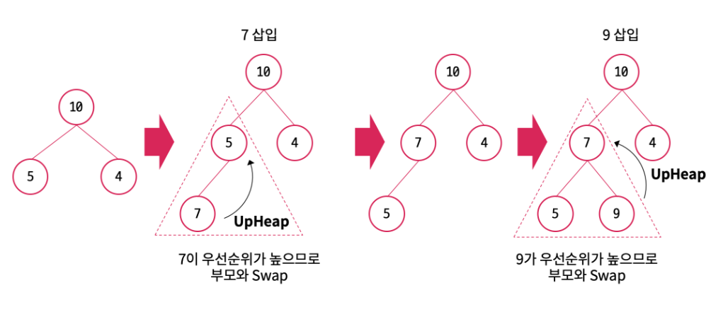 - 부모 노드와 우선순위를 비교하여 UpHeap