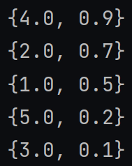 2차원 배열의 첫 번째 열 {1.0, }{2.0, }{3.0, }{4.0, }{5.0, }을 기준으로 내림차순 정렬하고 싶은 경우 다음과 같이 0번째 index의 값을 매개변수로 전달하면 된다.